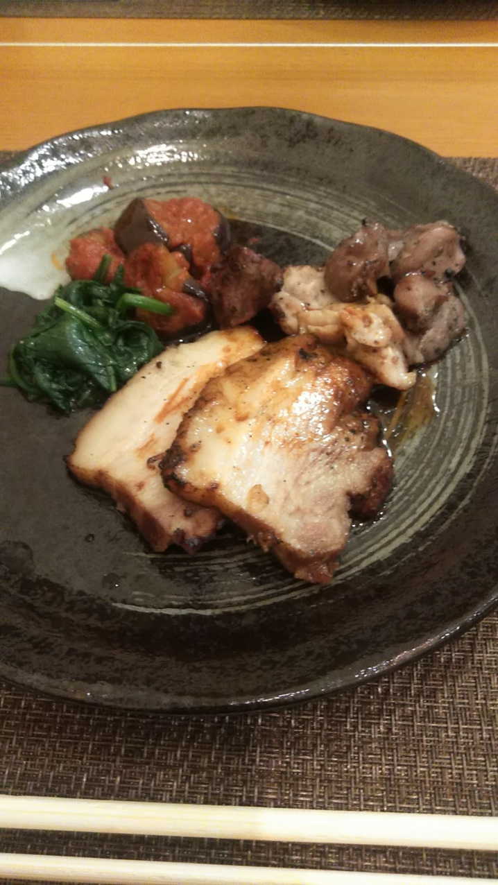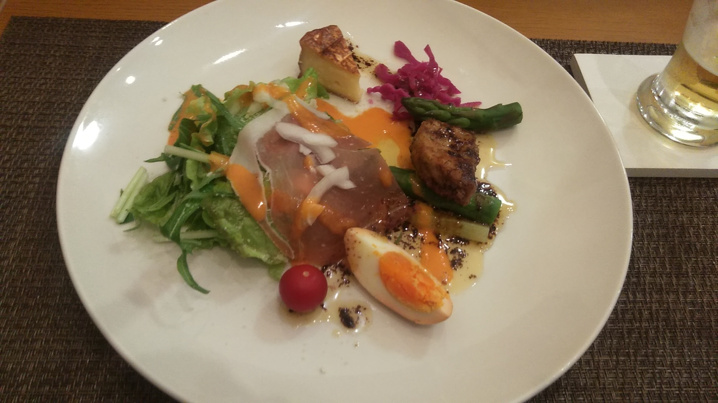 お肉は柔らかくとても上品でした(メインはよく煮込んだ豚肉、砂肝です)。生ハムサラダ(表現が稚拙で申し訳ありません・笑)には大好きなフォアグラが添えられており、ビールがすすみました。